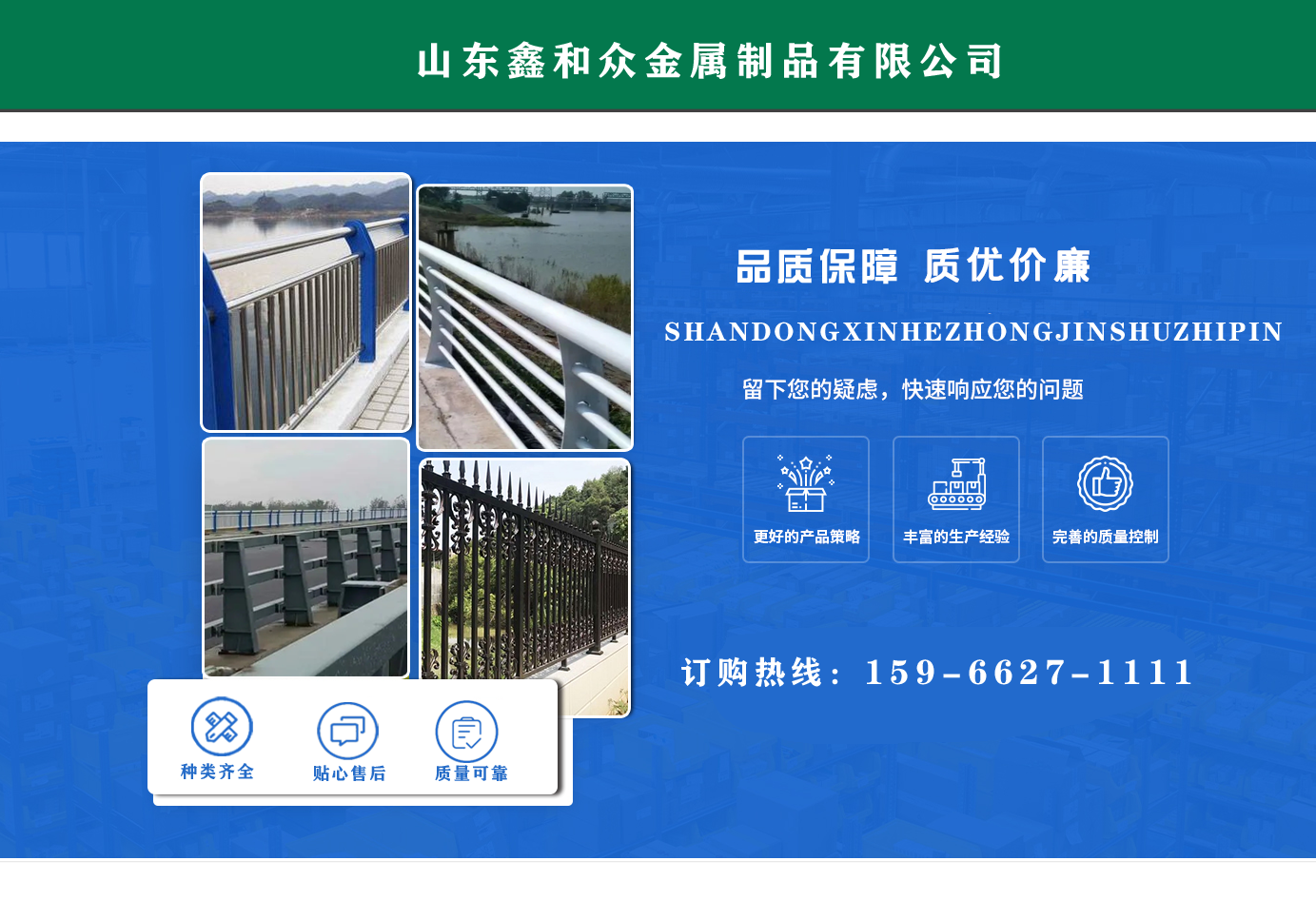 山東鑫和眾金屬制品有限公司主要產(chǎn)品有防撞護(hù)欄,橋梁護(hù)欄,道路護(hù)欄,河道護(hù)欄,不銹鋼護(hù)欄等護(hù)欄。提供設(shè)計(jì)方案,一站式定制,包您滿(mǎn)意價(jià)格優(yōu)惠,歡迎來(lái)電咨詢(xún)! 公司常年從事銷(xiāo)售護(hù)欄防撞護(hù)欄,橋梁護(hù)欄,道路護(hù)欄,河道護(hù)欄,不銹鋼護(hù)欄,橋梁鋼護(hù)欄,河道燈光護(hù)欄等。產(chǎn)品廣泛應(yīng)用于橋梁、河道、旅游景區(qū)、道路、公路、公園、小區(qū)、景觀(guān)、道路防撞等領(lǐng)域。 公司產(chǎn)品均采用優(yōu)質(zhì)不銹鋼材料,符合相關(guān)標(biāo)準(zhǔn)。各種型號(hào)不銹鋼復(fù)合管及護(hù)欄,質(zhì)量嚴(yán)格把控。產(chǎn)品強(qiáng)度高、耐腐蝕、焊接牢固、抗沖擊、性能好,防撞護(hù)欄結(jié)構(gòu)簡(jiǎn)單、美觀(guān)實(shí)用大方。 歡迎前來(lái)訂購(gòu)!...